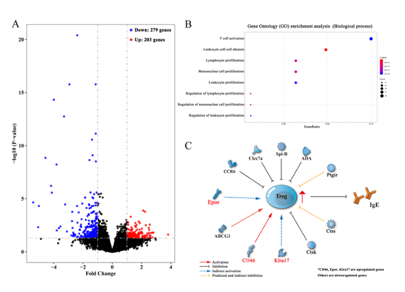 该研究采用卵清蛋白(OVA)为致敏原于第0天和14天皮下注射BalB/C鼠致敏,第20-24天雾化吸入1%OVA进入过敏性炎症的效应期,建立过敏性气道炎症的动物模型,于雾化吸入前一天(肺期)给予低剂量25尾日本血吸虫感染,实验对照组设立于致敏第14天(肺后期)感染等量的血吸虫,地塞米松治疗及PBS对照组等。实验结果观察发现肺期血吸虫感染可明显抑制肺组织灌洗液中炎症细胞因子IL-4、Eotaxin等的表达,减少肺灌洗液和外周血过敏原特异性抗体IgE和IgG亚型的分泌,可明显增加肺组织而不是外周脾组织的Treg细胞的表达比例。接下来我们采用Treg敲除实验证实肺期血吸虫感染主要通过Treg细胞来改善其过敏性炎症的发生。进一步我们通过过继转输CD45.1+ OT II 鼠来源的CD4+ T 细胞至CD45.2+鼠内,给予诱导过敏性气道炎症模型和血吸虫感染,发现,肺期血吸虫感染主要显著上调肺组织微环境中OVA特异性的Treg比例而非非特异性Treg。进一步继续采用转录组测序分析揭示肺期血吸虫感染可能显著上调肺组织微环境中Treg细胞比例的潜在分子机制。