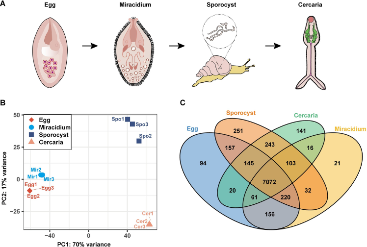 图1.日本血吸虫四个不同生命阶段的全局转录组谱