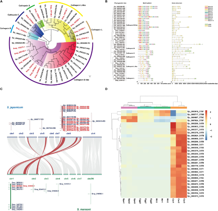 图2.日本血吸虫木瓜蛋白酶基因家族的全基因组鉴定、表征和表达模式分析。